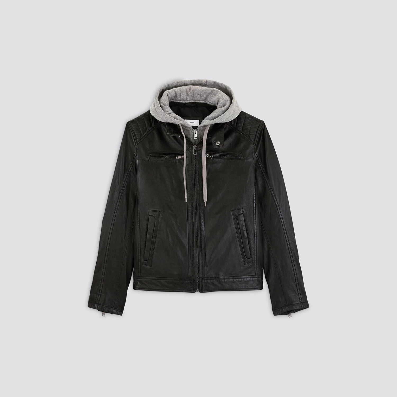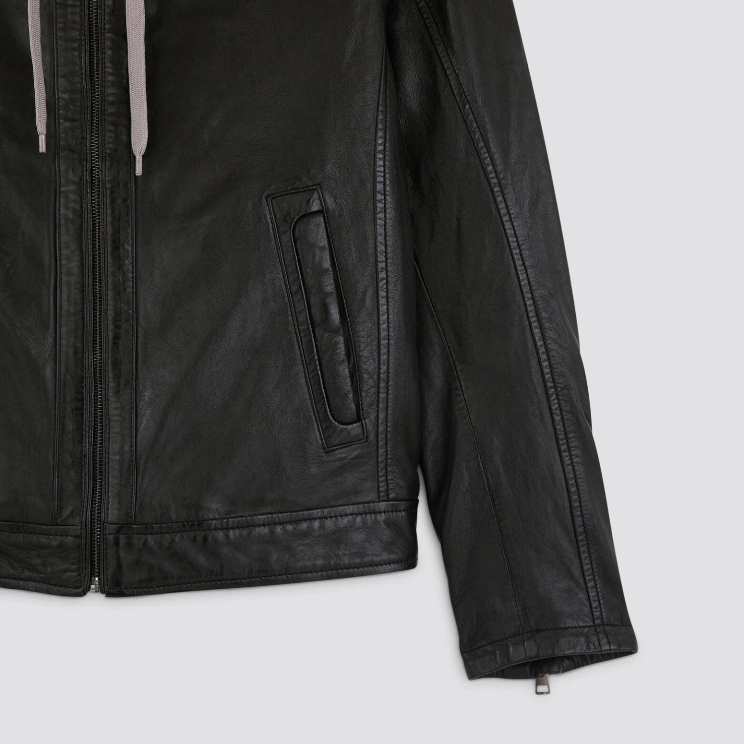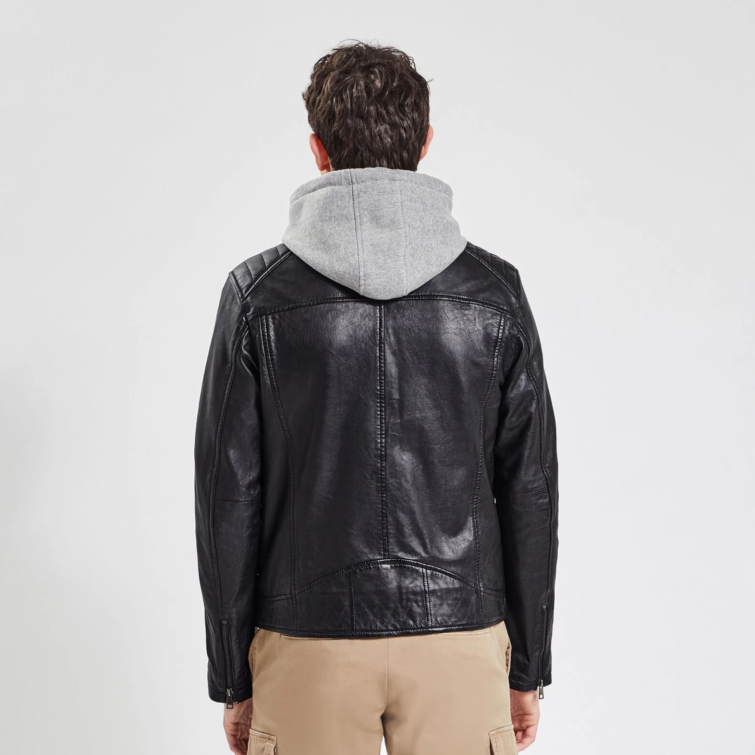 Ce blouson noir en cuir de mouton possÚde un col biker, une capuche en jersey amovible avec cordon de resserrage et de multiples poches extérieures et intérieures.