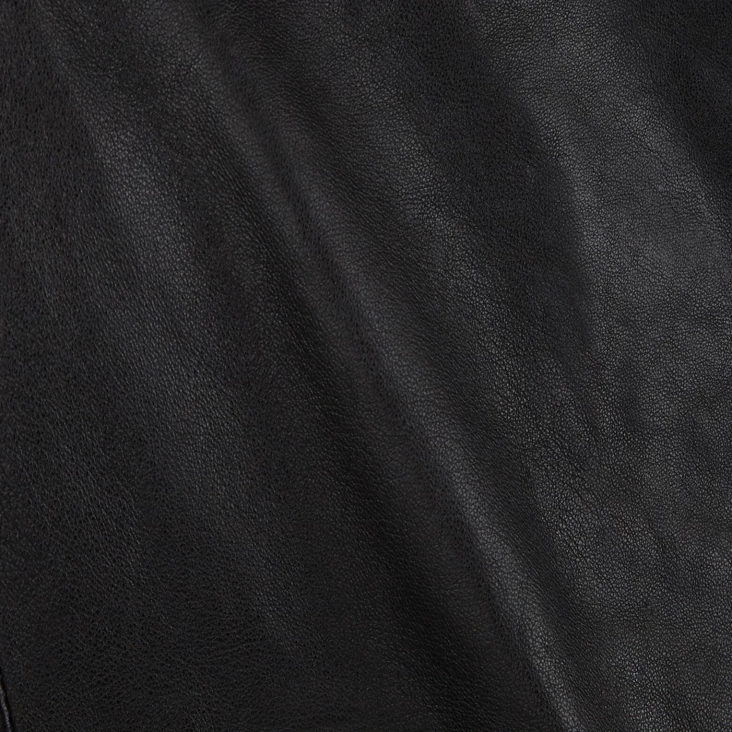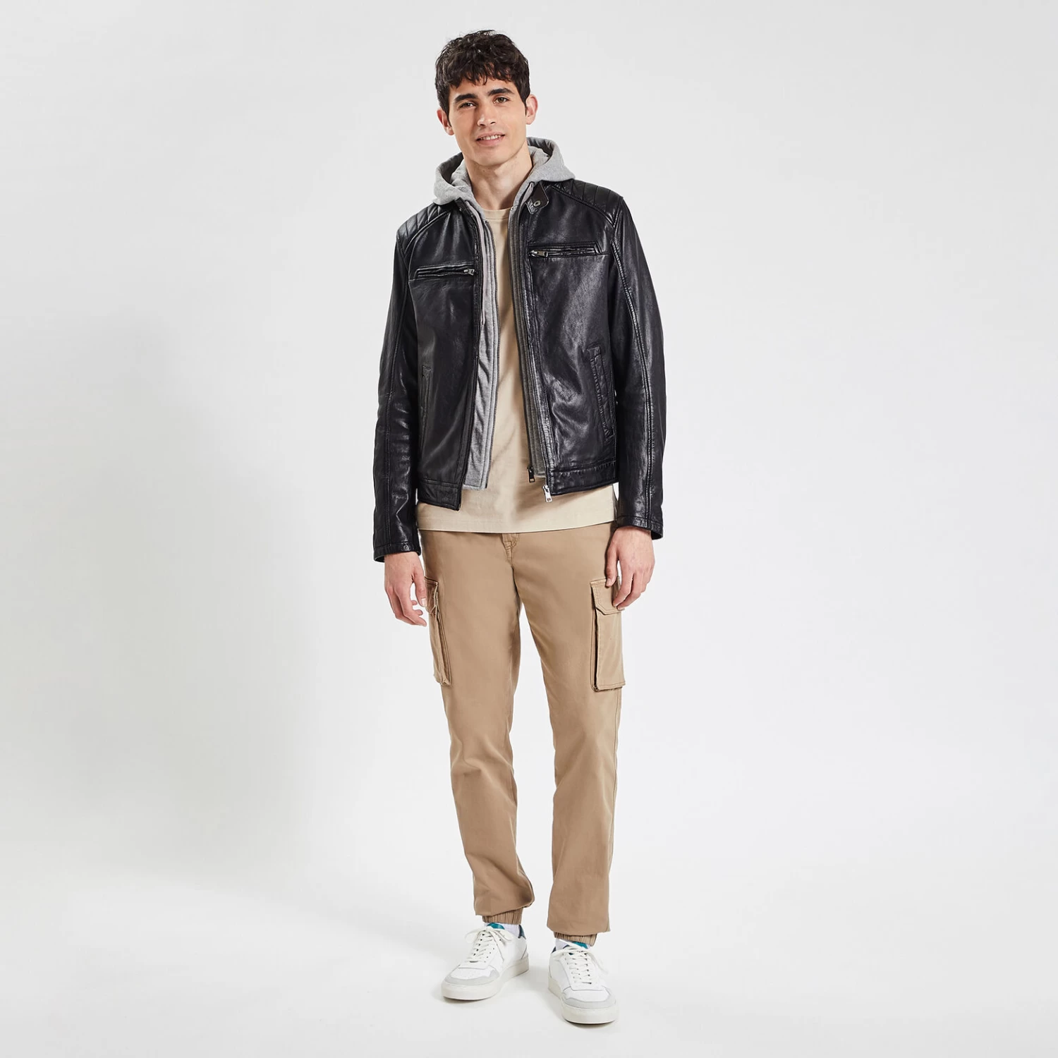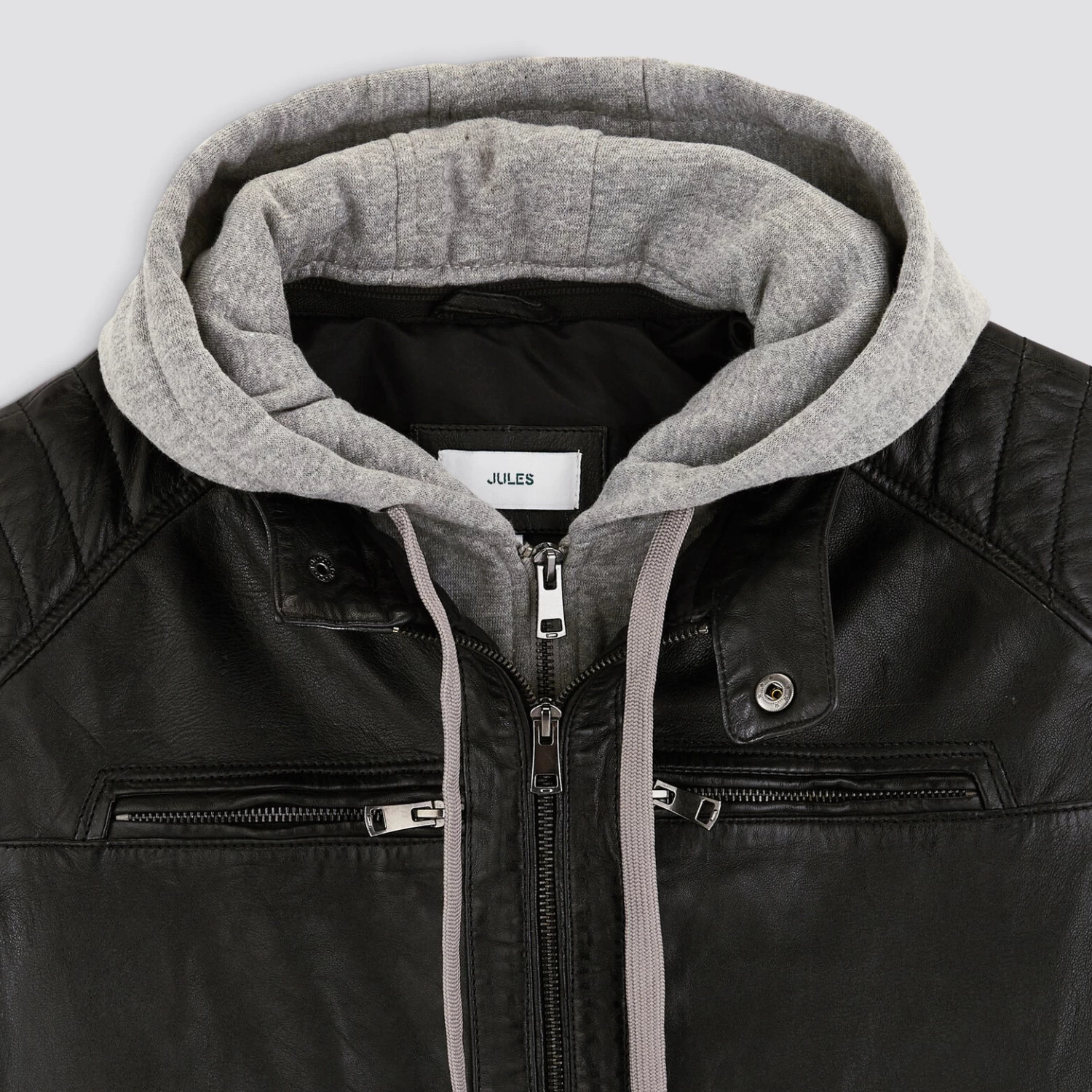 Ce blouson noir en cuir de mouton possÚde un col biker, une capuche en jersey amovible avec cordon de resserrage et de multiples poches extérieures et intérieures.