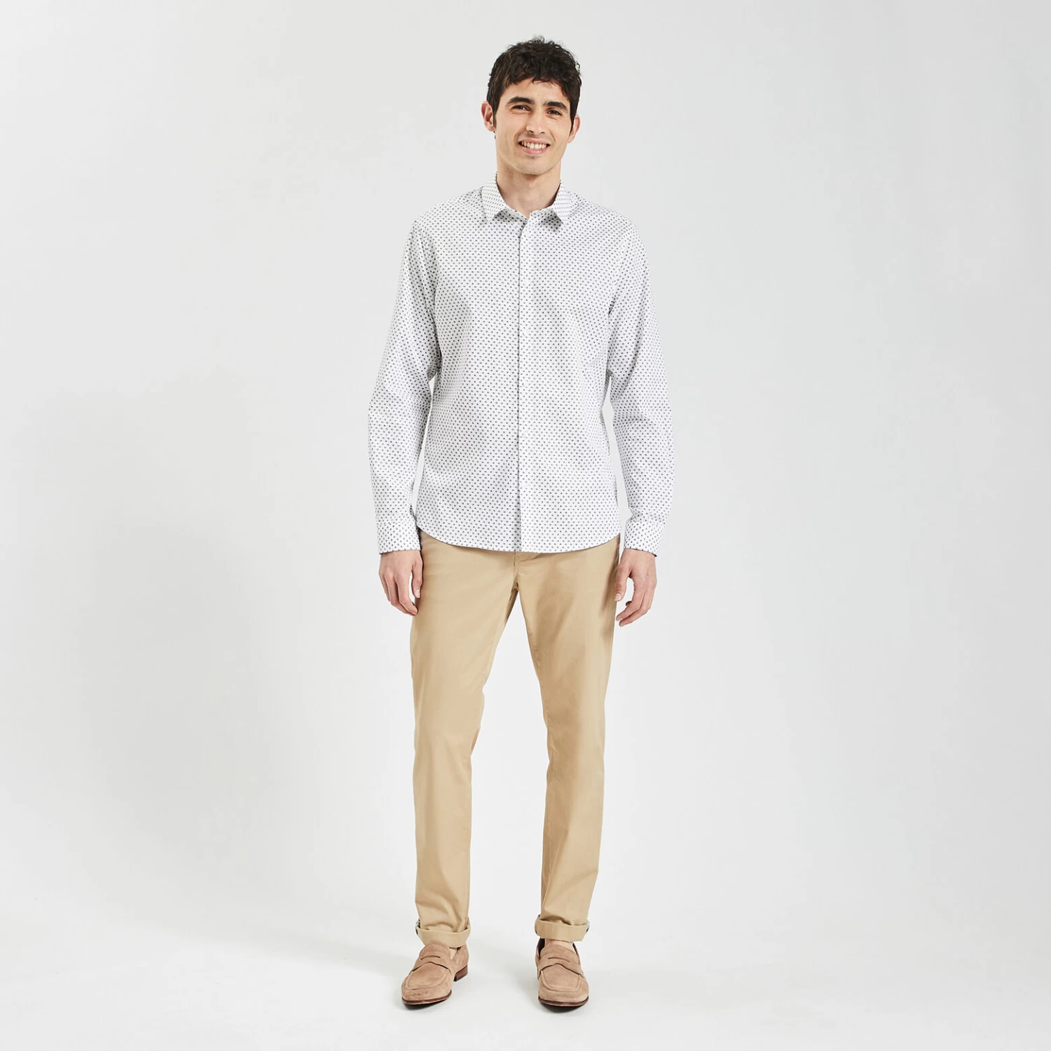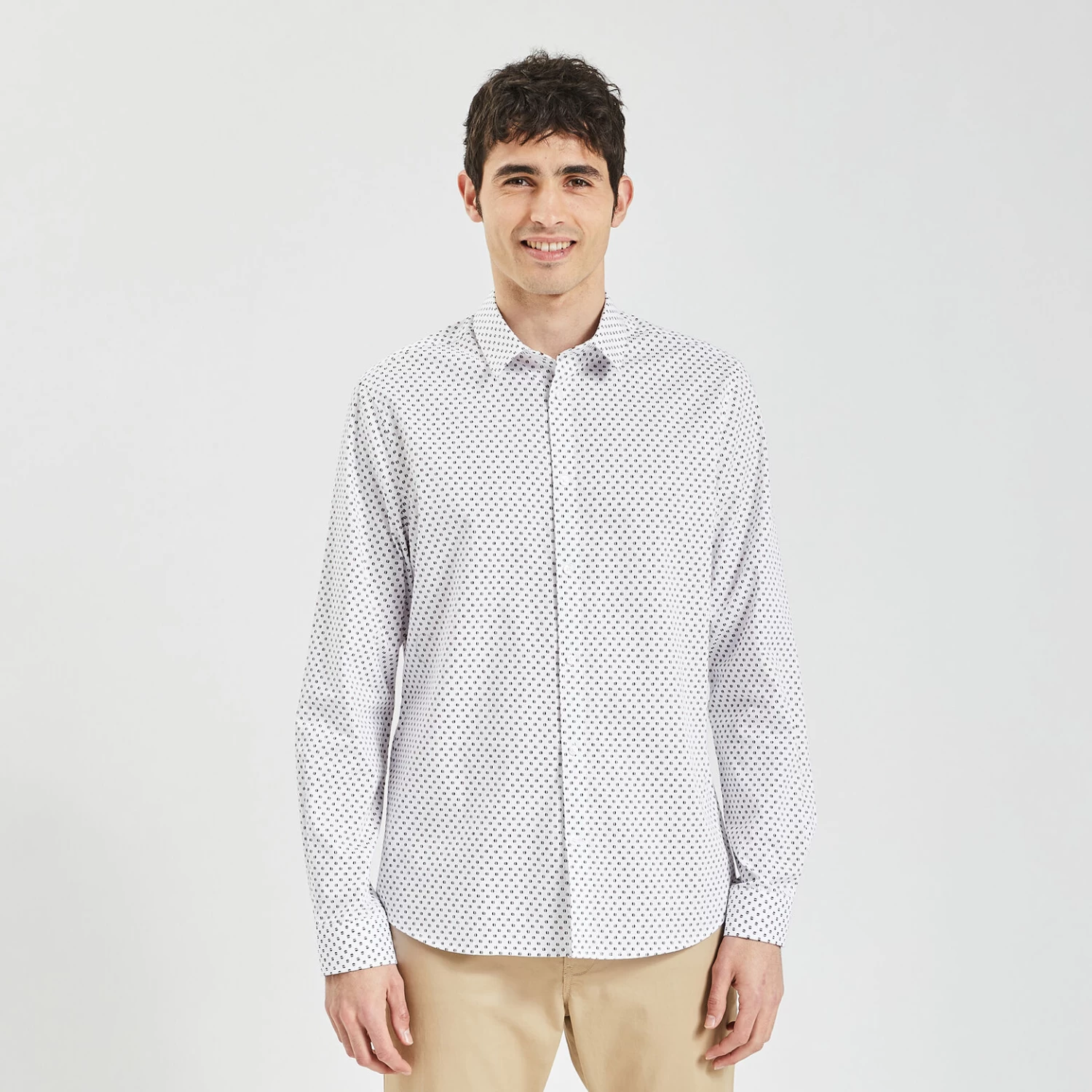 Cette chemise imprimée géométrique est confectionnée en 100% coton dobby qui allie la douceur du coton à la texture alvéolée et soyeuse de son tissage. Fibre naturelle, le coton est léger et respirant, hypoallergénique et adapté aux peaux sensibles. La chemise en dobby se prête aux occasions élégantes.