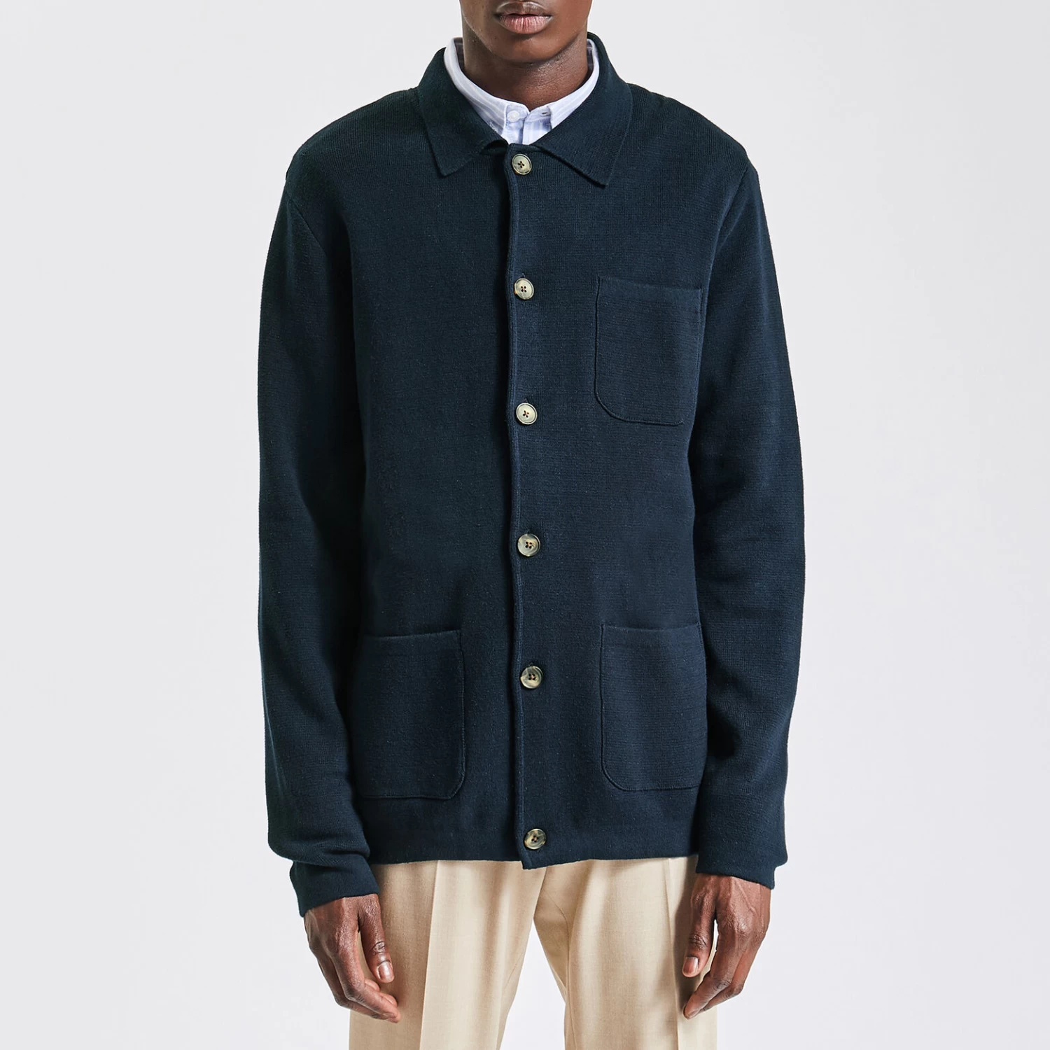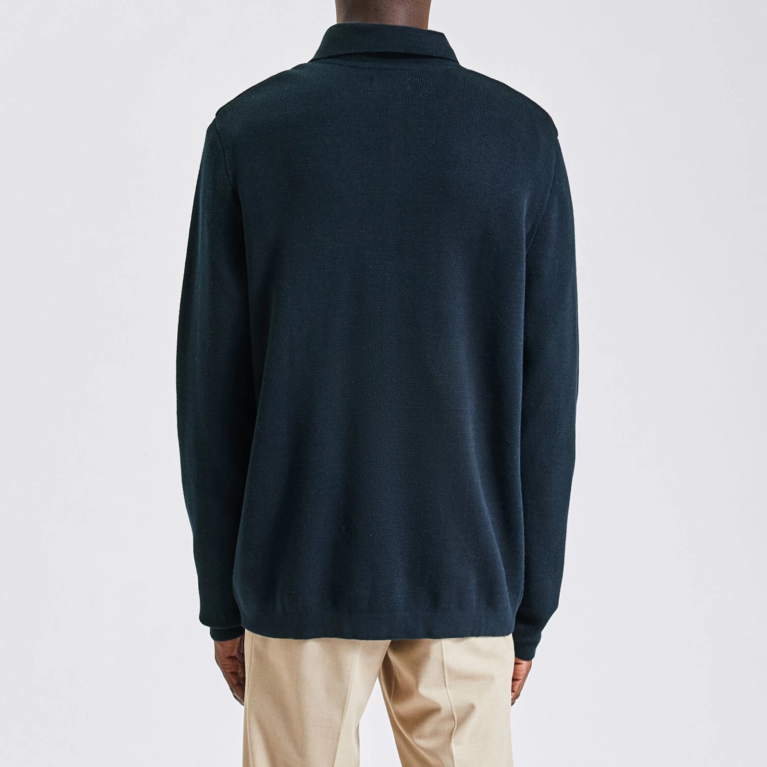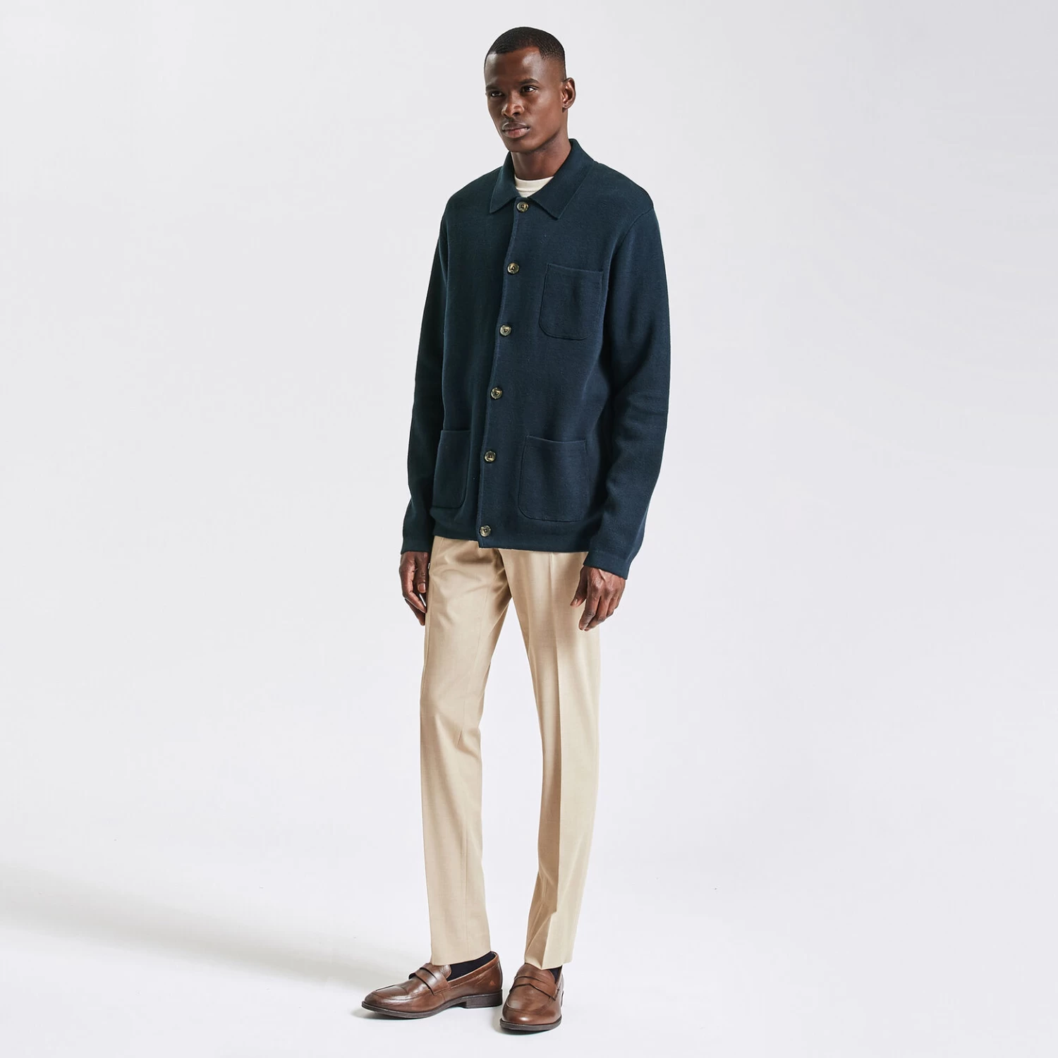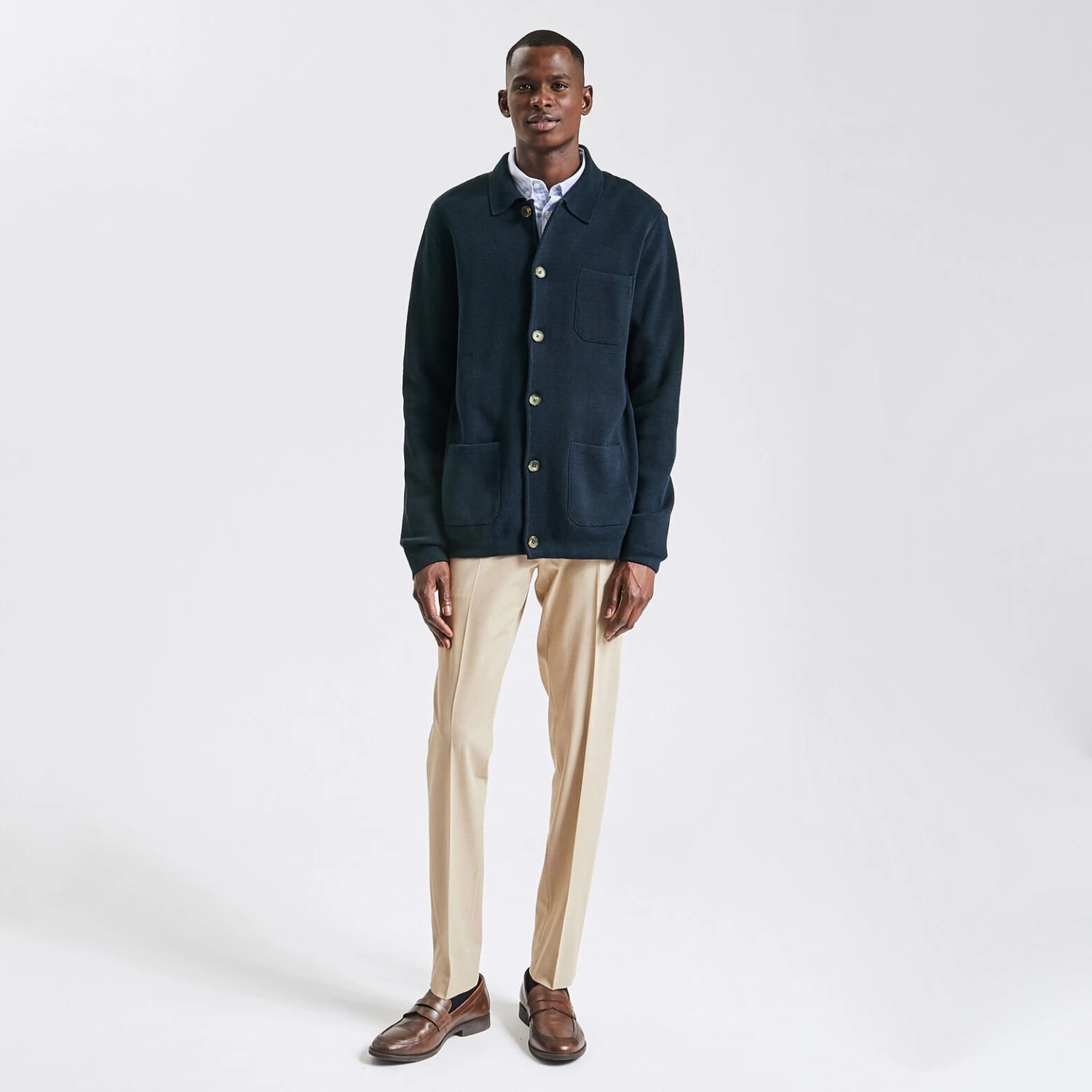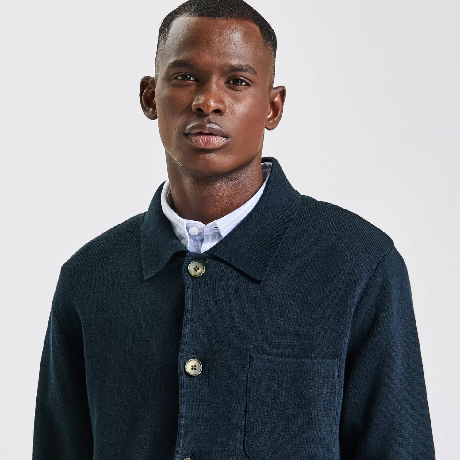 Ce gilet en maille possède une fermeture boutonnée, un col polo, deux poches latérales plaquées, et une poche poitrine plaquée. Il possède des bas de manche et un bas de corps en bord-côtes. Sa coupe est regular, pour un porté décontracté.