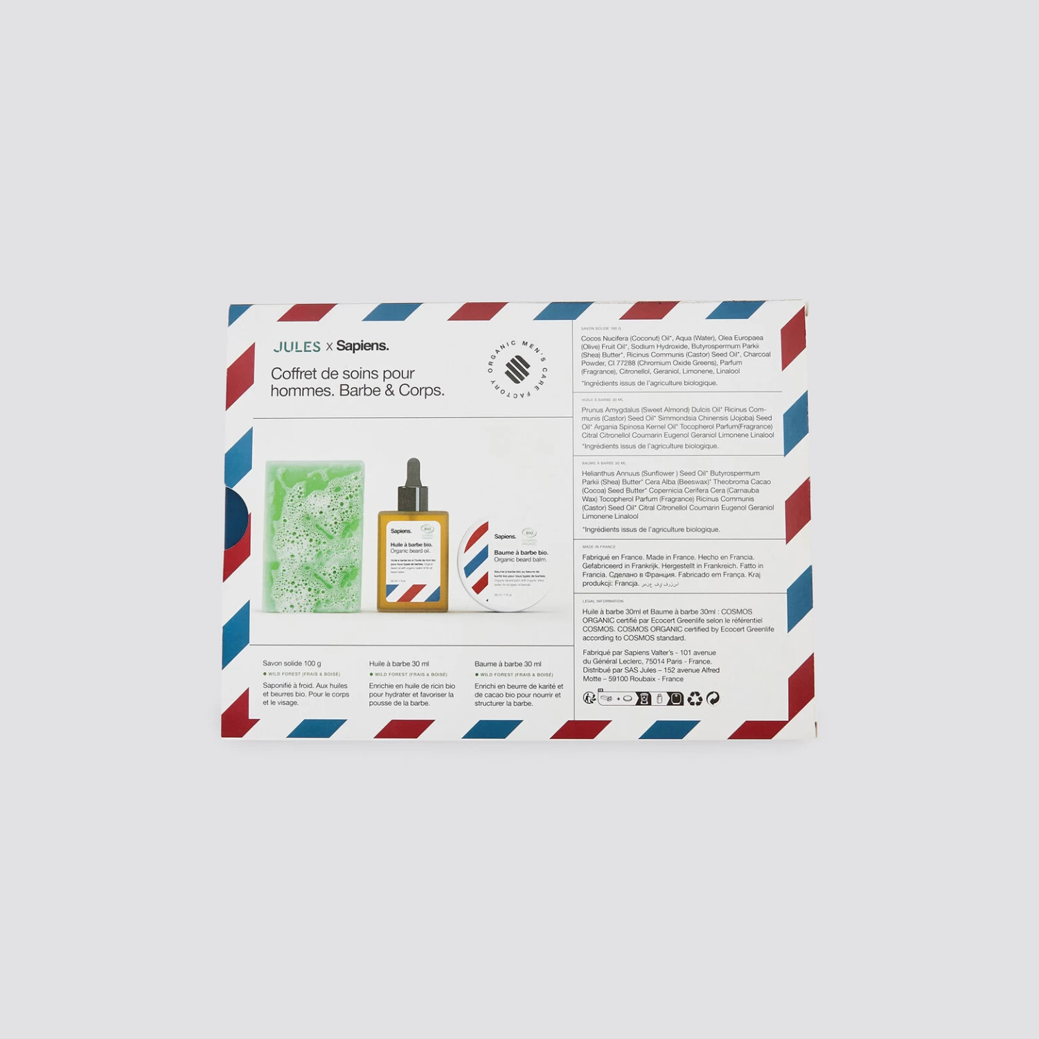 Ce kit cosmétique pour barbe et corps est fabriqué en France. Il comporte un savon solide 100g, une huile à barbe de 30 ml et un baume à barbe de 30 ml.