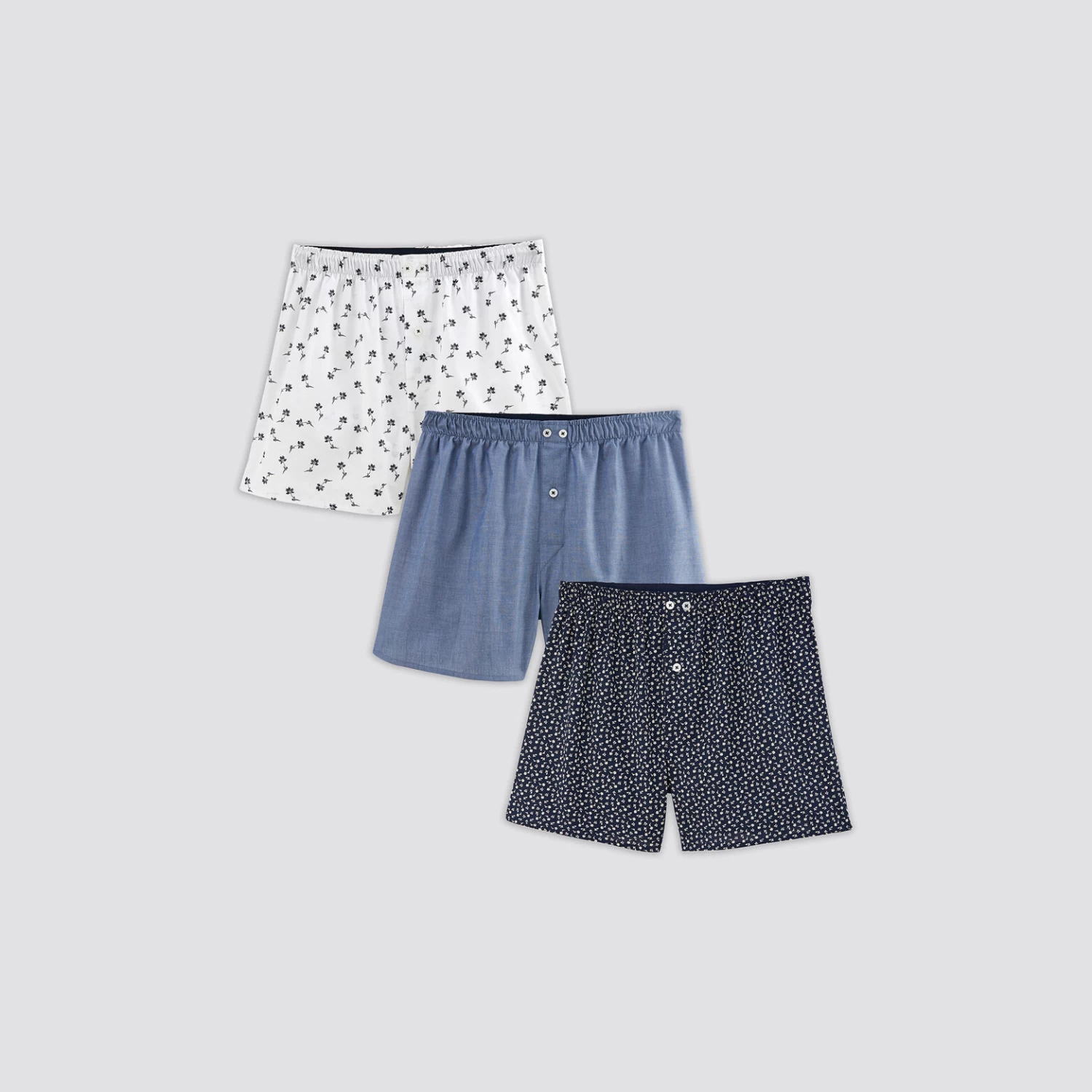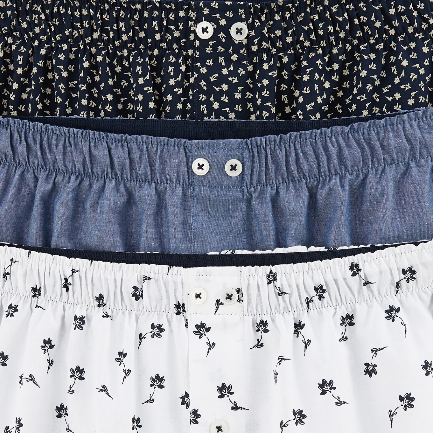 Ce lot de 3 caleçons fantaisies est composé de deux caleçons à fleurs et d’un caleçon uni.