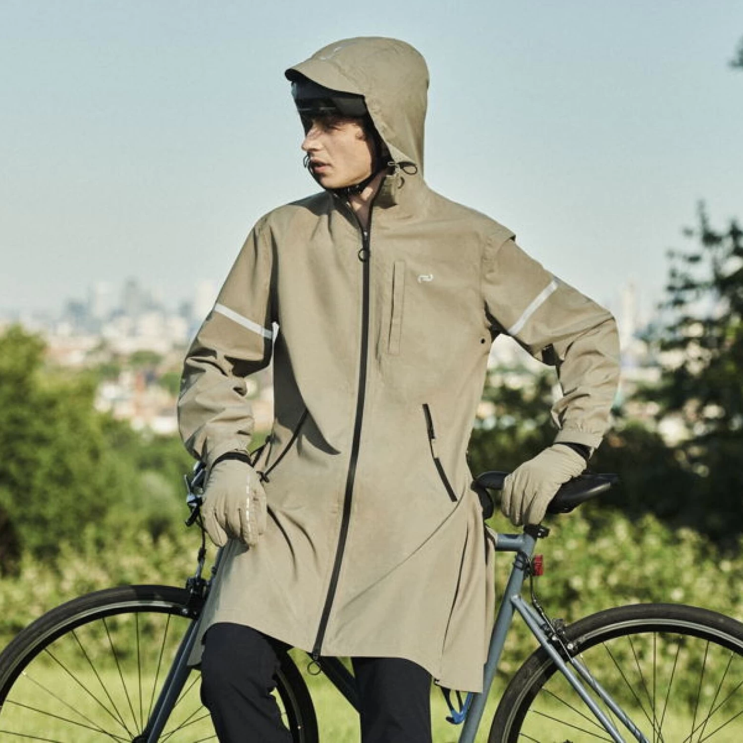 Ce manteau hybride mobilité douce possède une capuche à large visière avec cordon de serrage, pour pouvoir porter son casque de vélo en même temps, une poche passepoilée pressionnée poitrine, 2 poches zippées avant, une fermeture zippée double curseur, des bas de manches resserrables et un bas de corps avec cordon de serrage également. Le manteau est doté d’imprimés réfléchissants à la lumière sur la capuche, le haut du dos et les bras. Tous les zips sont imperméables et les poignets sont ajustables par élastiques et velcro.
