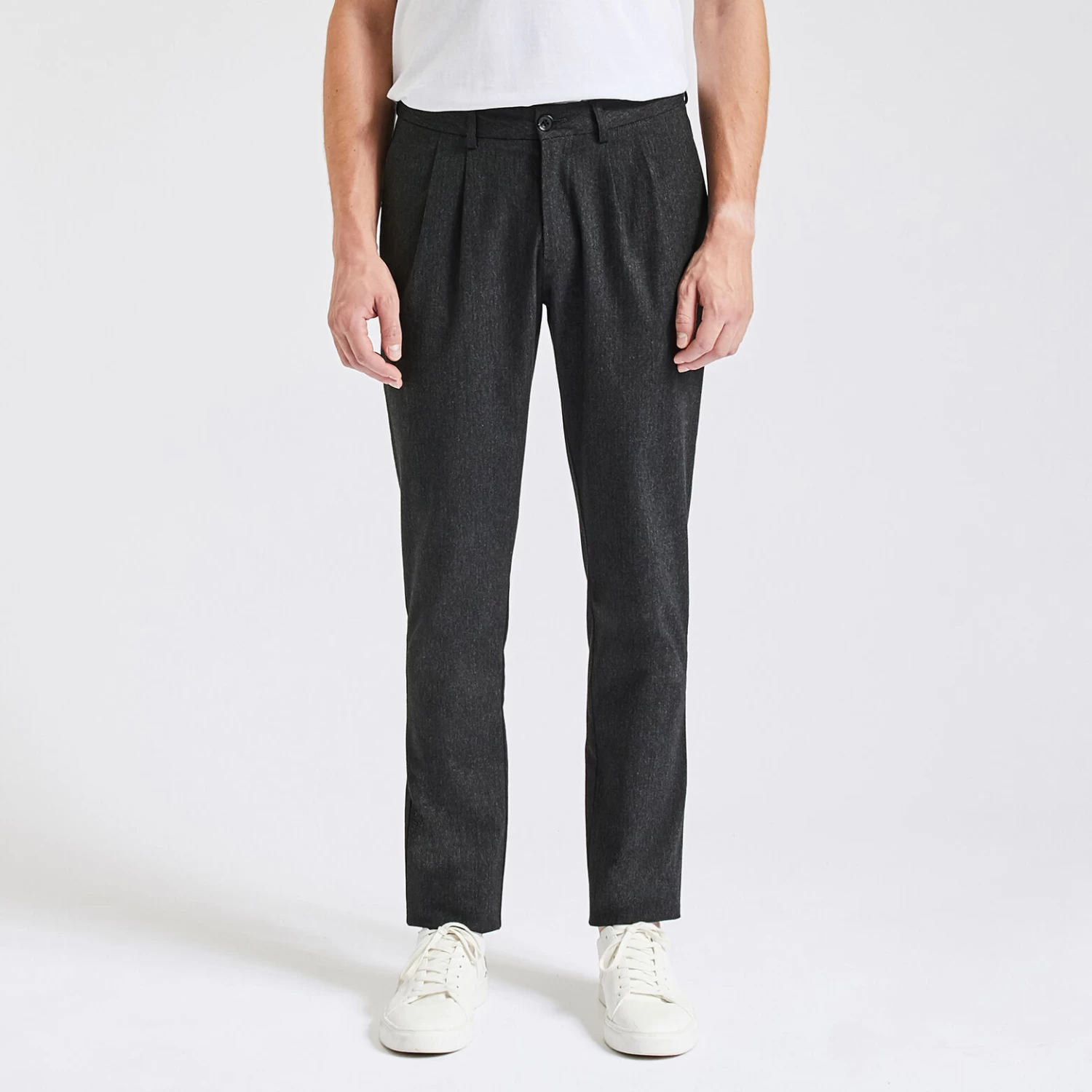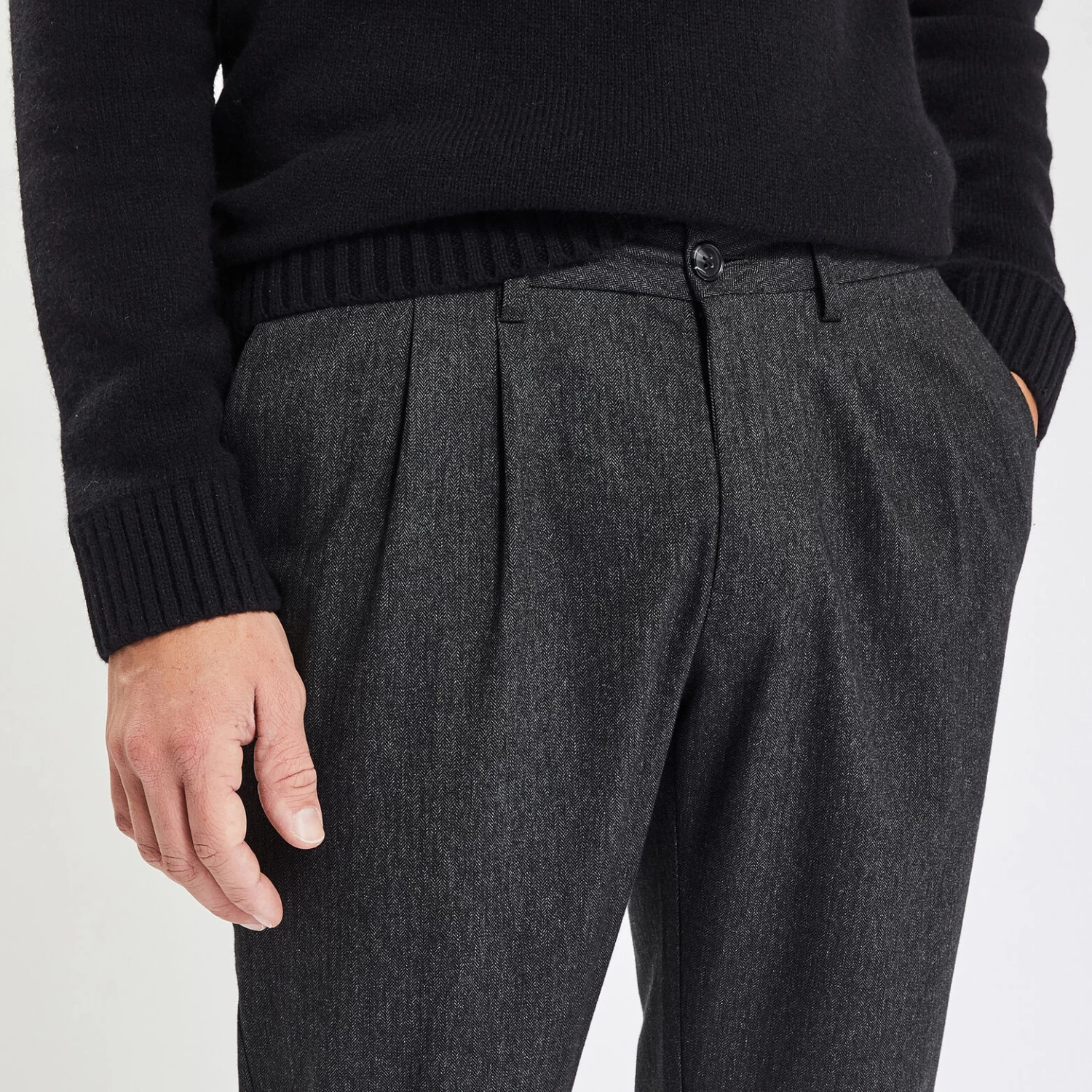 Ce pantalon fantaisie chevron possède des plis sur l’avant et une coupe loose, pour un porté souple et décontracté.