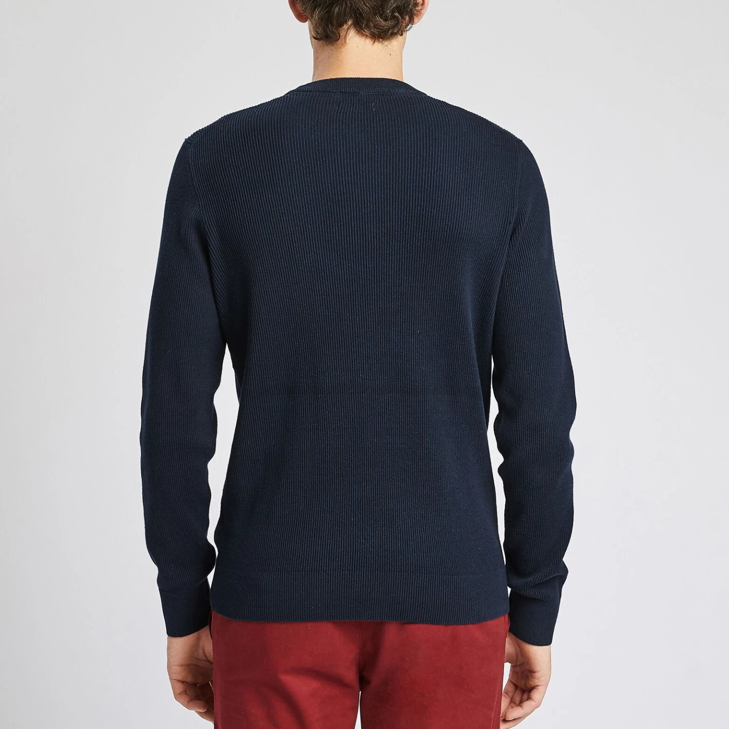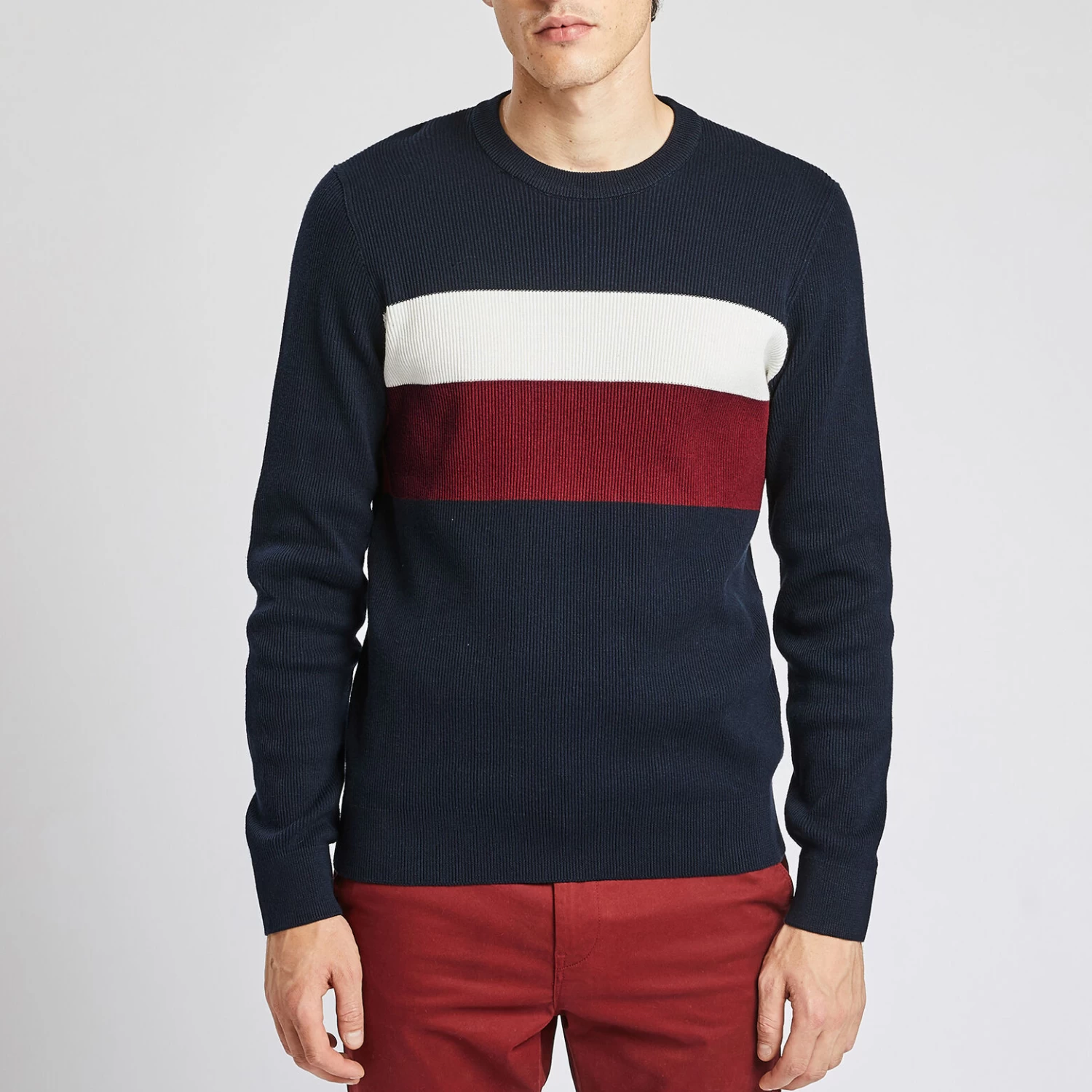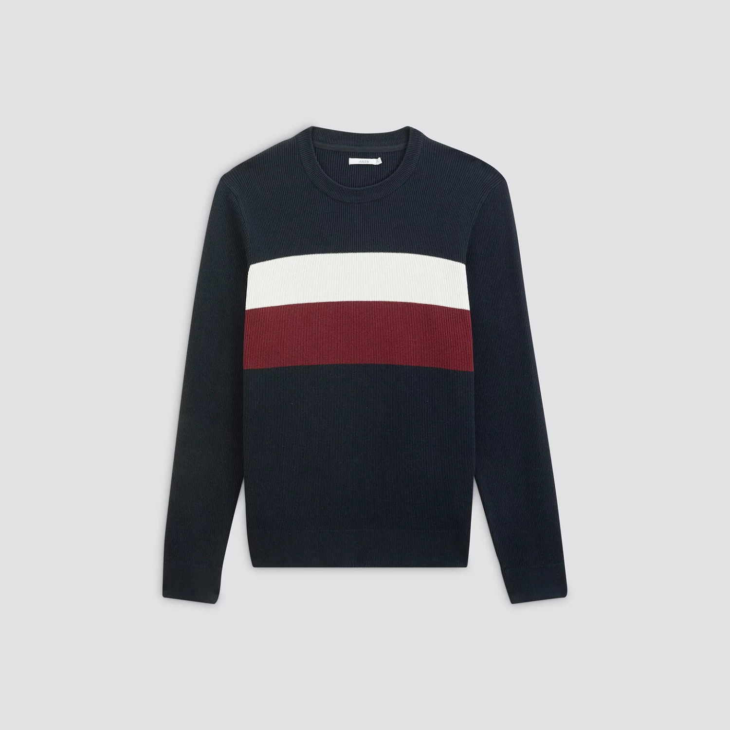 Ce pull colorblock à manches longues avec des rayures sur la poitrine possède un bas de corps et des bas de manches en bord-côtes ainsi qu’une coupe slim, pour un porté élégant.